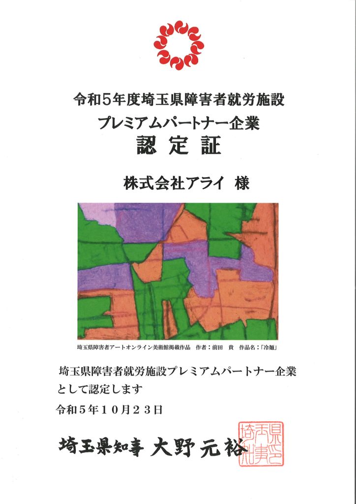 障害者就労施設の工賃向上を推進するため、障害者就労施設からの物品の調達や障害者就労施設への販売機会の提供等を積極的に取り組む企業を、毎年度、前年度の実績に基づき、「プレミアムパートナー企業」・「パートナー企業」・「サポーター企業」として埼玉県が認定等を行います。