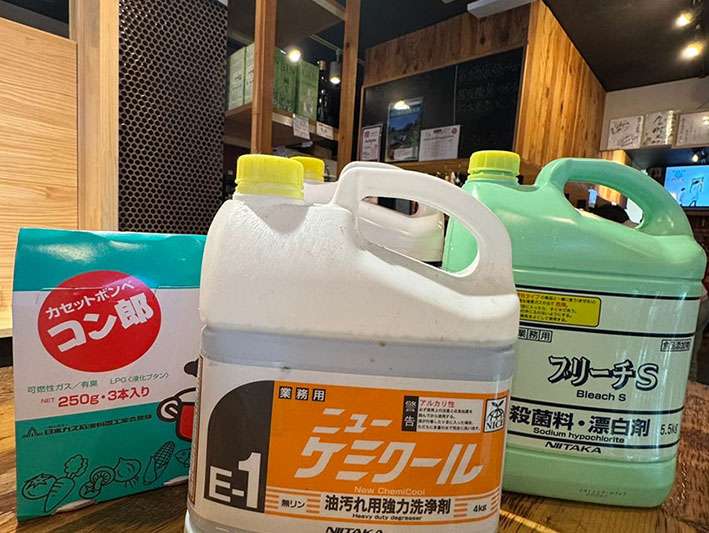 グラス類、ボトルネーム、食器用洗剤、アルコール、炭、箸類、袋類、ラップ、アルミホイル、マドラー、おしぼり、ペーパータオル、ストロー
